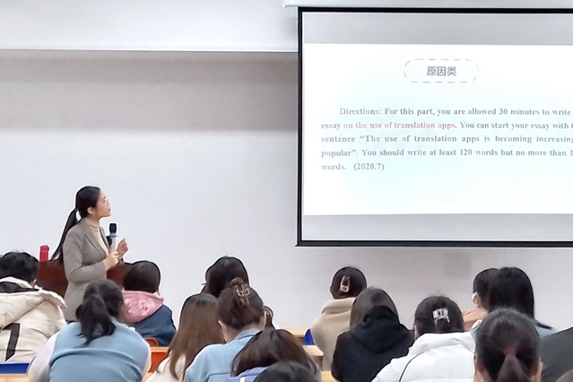 活动伊始,主讲老师详细地向同学们介绍了四六级考试的题型,随后有针对性从考试时间安排、审题技巧以及解题策略为同学们做了详细的分析与指导。最后老师针对同学们考试准备过程中遇到的听力、写作等问题,向大家介绍了“听力先看选项”“作文三段论”、“长短句结合”等高效的学习方法,使同学们获益匪浅。