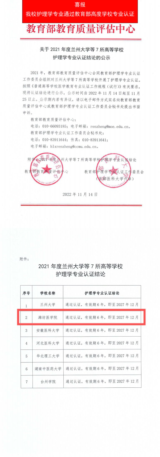 11月14日,教育部教育质量评估中心、教育部护理学专业认证工作委员公示了2021年高等学校护理学专业认证结论,捷克论坛 完成了教育部护理学专业认证工作委员会组织的学校自评、专家组现场考察、结论审议等程序,通过专业认证,有效期为6年,即至2027年12月。