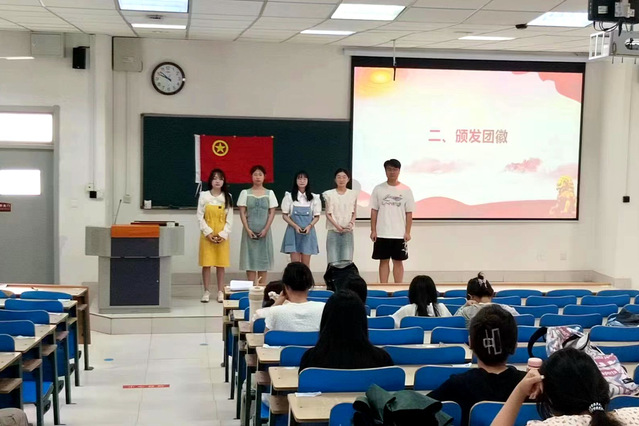 入团仪式在庄严的国歌声中开始,全体团员目光坚定、庄严肃穆,带着激动的心情唱响国歌。主持人为新发展团员讲述入团仪式的意义并宣读新团员名单,老团员代表为新团员们佩戴团徽。全体团员高举右拳进行入团宣誓,以饱满的精神面貌向团组织坚定表明为共产主义事业而奋斗的理想信念入团仪式在团歌《光荣啊,中国共青团》合唱中顺利结束。