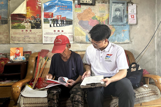 在当地村支书的带领下,带队老师与志愿者们踏入老党员的家门,共同回溯那一段段激情燃烧的峥嵘岁月。老党员伊廷玉于1971年入党,早年投身部队,后在县城工作直至退休。回忆起往昔岁月,他目光坚定,感慨万千。老党员公相东则满怀深情地与大家分享自己撰写的《思故乡》《喜迎二十大》等文稿。这些作品生动描绘了沂蒙六姐妹为当地作出的杰出贡献,以及乡村振兴战略给民众生活带来的翻天覆地的变化。还有老党员伊廷俭,他于1973年入党,曾是54团162师四八六团的英勇战士。走进他的家中,毛主席的挂像格外醒目。一句“听党安排,随时准备战斗!”掷地有声,让大家深刻领悟到了爱国主义和革命精神的真正内涵。