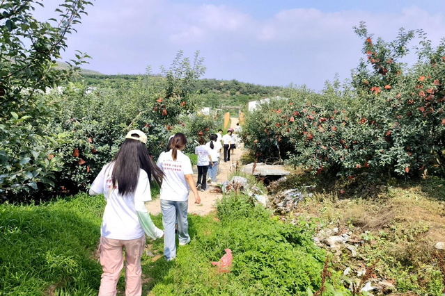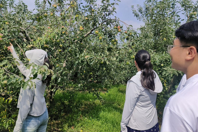 志愿者们走进苹果和蜜桃种植园,通过近距离观察果树的生长情况,了解到每一棵果树都需要精心的照料,从施肥、修剪到采摘,每一个环节都凝聚着果农的辛勤与智慧。为了进一步了解当地苹果和蜜桃产业的发展脉络与未来愿景,志愿者们向当地种植户展开调研,并根据现状积极建言献策,建议果农可以利用互联网进行线上直播,扩大当地产业品牌影响力。