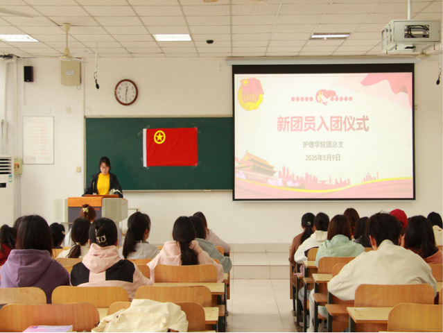入团仪式在庄严的国歌声中拉开帷幕,与会团员全体起立,唱响国歌。主持人宣读2025年上半年新团员名单,共有27名先进青年光荣入团。新团员代表们在热烈的掌声中,从优秀团员代表手中接过象征荣誉与责任的团徽徽章和团员证。团徽闪耀,承载着共青团的使命,激励新团员们奋勇前行。面对团旗,新团员们紧握右拳,以坚定洪亮的声音许下铮铮誓言,展现出新时代护理青年的责任担当。
