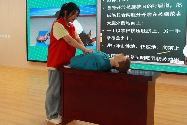 活动当天,志愿者们生动讲解了海姆立克急救法、心肺复苏等急救知识要点,结合心肺复苏假人模型、海姆立克急救训练器具及自动体外除颤器(AED)等专业教具演示标准操作流程,组织师生分组开展实践训练,现场进行“一对一”及“一对多”操作指导。学校师生积极参与,动手实践,现场气氛热烈,学习热情高涨。