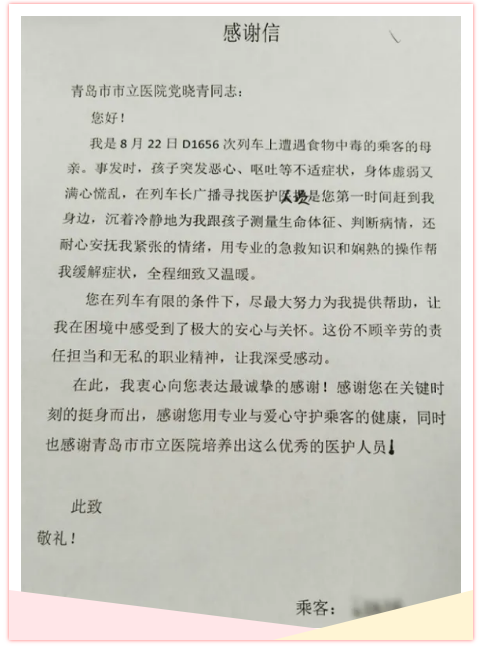 “您在列车有限的条件下,尽最大努力为我提供帮助,让我在困境中感受到了极大的安心与关怀……” 信里的字字句句,记录着 8 月 22 日 D1656 次列车上的惊险时刻:一列从青岛开往呼和浩特的高铁上,一对母子因食物中毒突发急症,孩子面色苍白、脉搏微弱,母亲也因同样症状陷入危急。